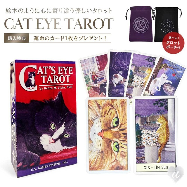 [正規品] 豪華特典付き ポーチ付き キャッツアイ 商品管理番号:20250826-6915 【セット内容】 ・タロットカード78枚(大アルカナ22/小アルカナ56) ・英語解説書(全カード解説あり) ・特典「運命の1枚」 【選べるポーチ】 ・月と星のミッドナイト ・神秘の魔法陣 パープル ・神秘の魔法陣 ブラック ・リーディングハンド&カードモチーフ 【サイズ】 カードサイズ:縦約12cm×横約7cm 箱サイズ:縦約12.3cm×横約7.2cm×厚み約3cm *測定許容誤差は±0.2cmです 全体重量 約245g 素材 紙 ※日本語の解説書は付属しておりません ※裏柄、線、色、外箱のデザイン等、予告なく仕様が変更する場合がございます ※こちらの商品は新品未使用品ですが、検品のためランダムに開封している場合がございます。また、海外輸入品のため輸送や保管の際に外箱に多少のスレや凹み、潰れ、破れなどが発生する場合がございます。予めご了承ください 猫好き必見!猫の目線で描かれた、愛らしくも奥深いタロットカードです。 『Cat's Eye Tarot』は、獣医師Debra M. Givin氏によって制作された全78枚のタロットデッキ。ライダーウェイト版をベースにしながら、猫たちのしぐさや暮らしの中にタロットの象徴を落とし込んだユニークな構成が特徴です。 スート(小アルカナ)は、魚・鳥・爬虫類・ネズミなど、猫たちが本能的に惹かれるモチーフで構成。カード1枚1枚がまるで絵本のようにストーリー性を持ち、初心者でも直感的に意味を読み取れます。