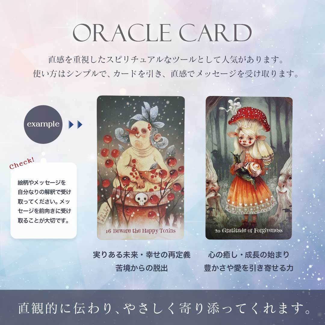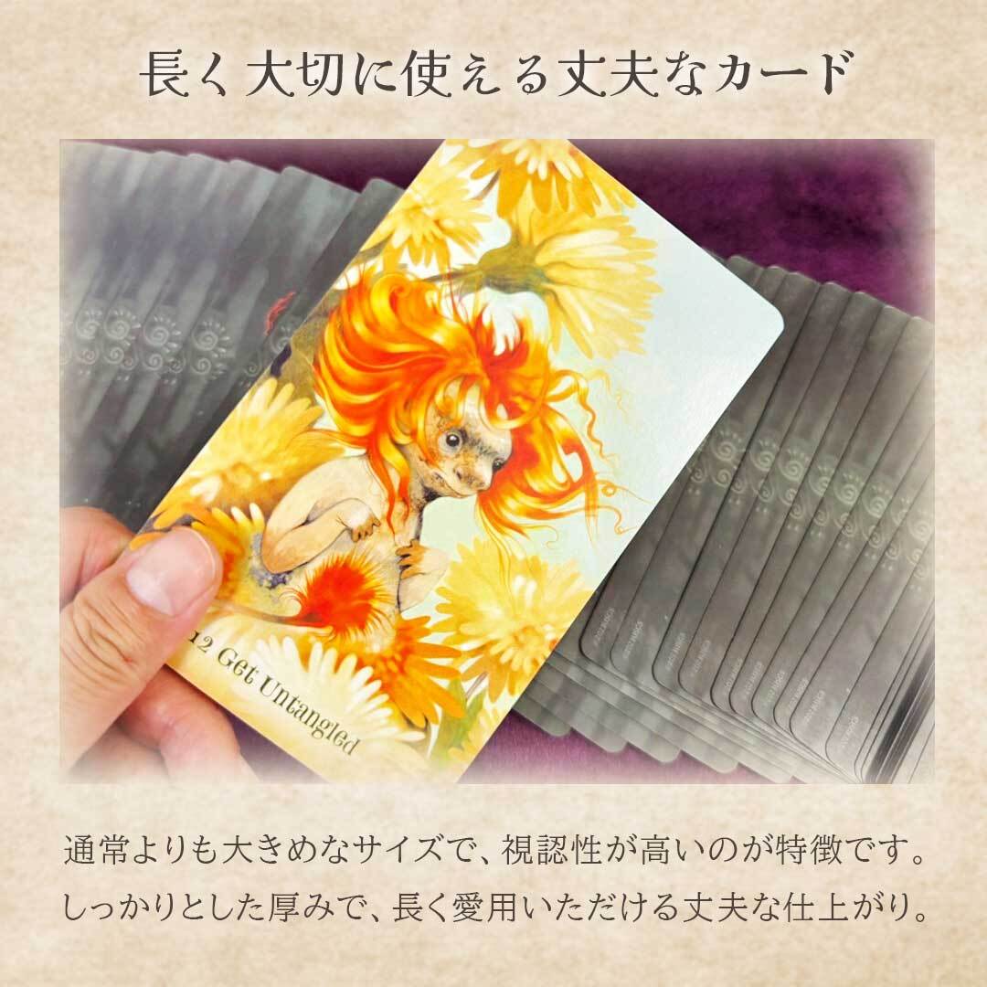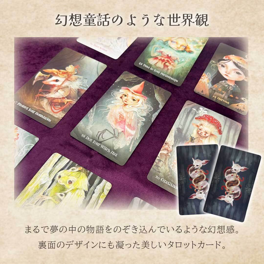 描かれるのは、どこか懐かしく、そして少し不思議なクリッターたち。幻想童話のようおな世界観の中で、あなた自身の本質や感情に語りかけるメッセージを届けてくれます。直感と物語が交差するこのデッキは、日常に優しい魔法を添えてくれます。