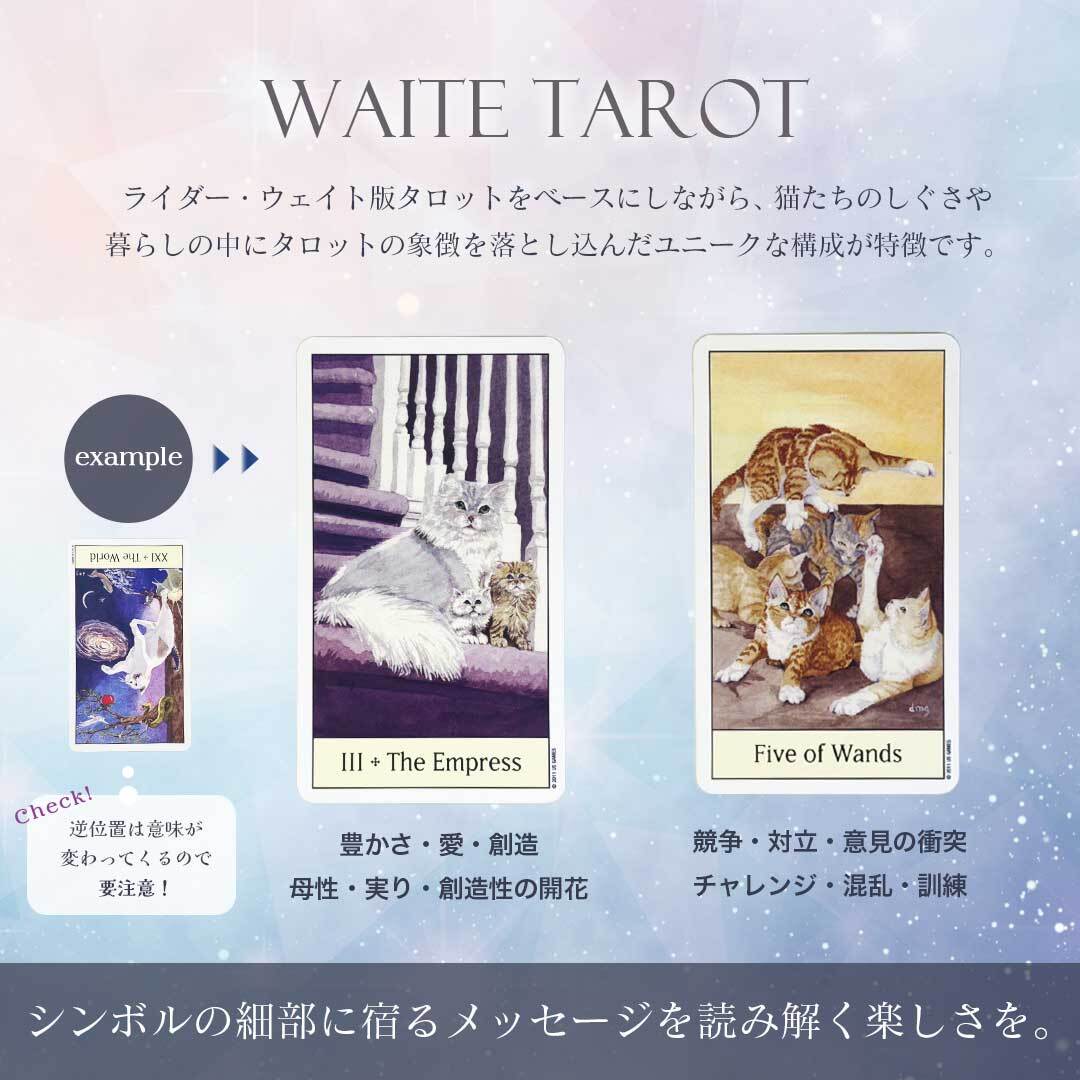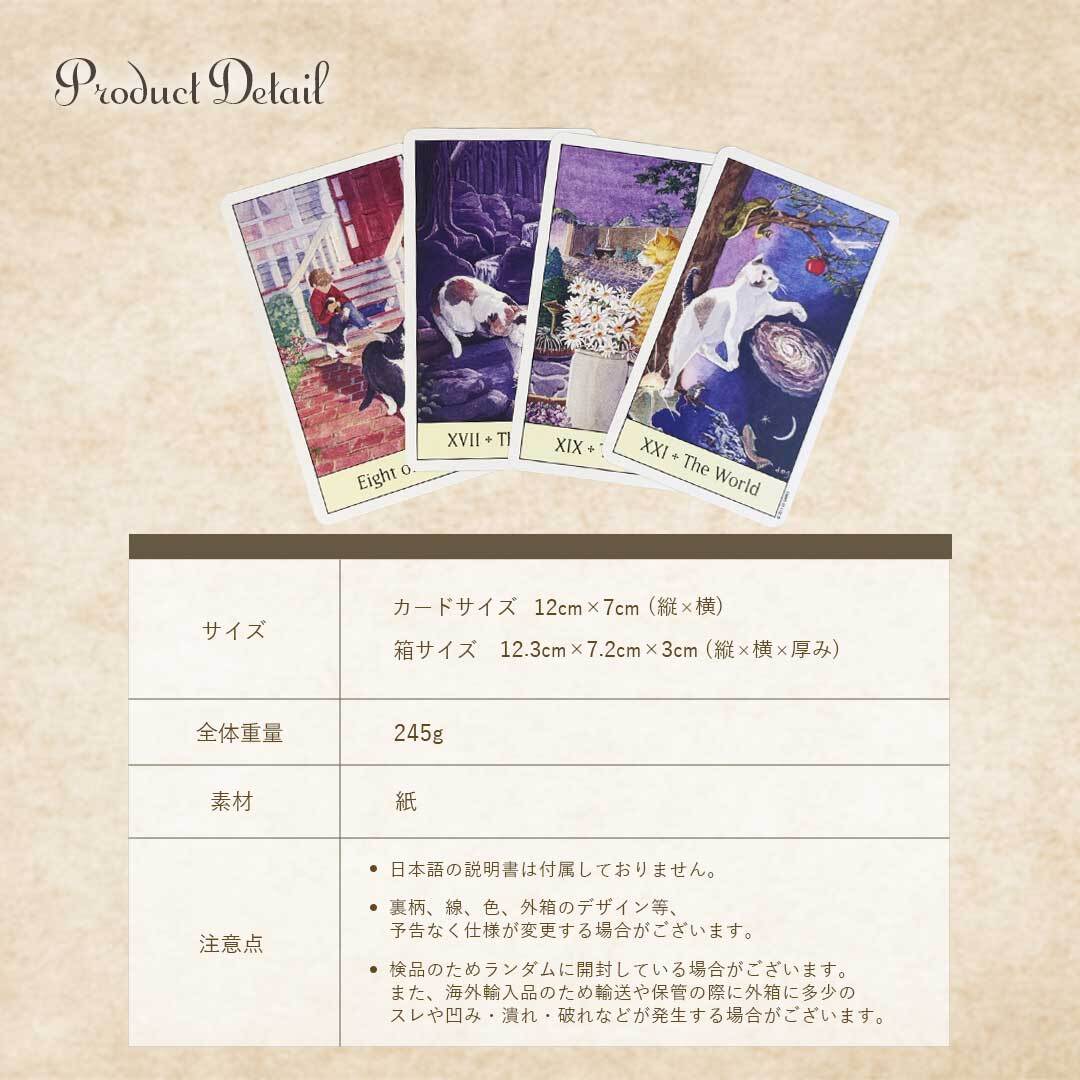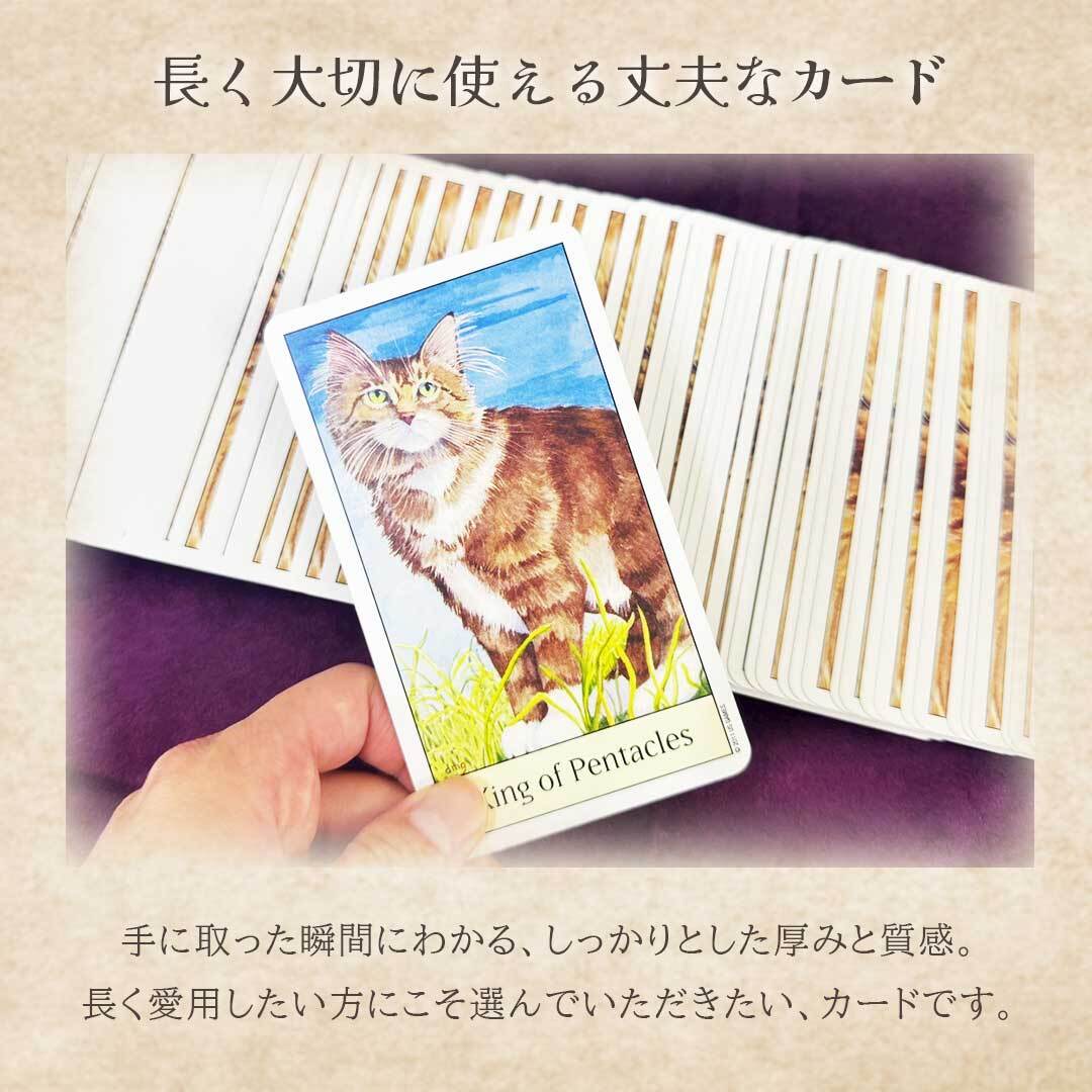 スート(小アルカナ)は、魚・鳥・爬虫類・ネズミなど、猫たちが本能的に惹かれるモチーフで構成。カード1枚1枚がまるで絵本のようにストーリー性を持ち、初心者でも直感的に意味を読み取れます。