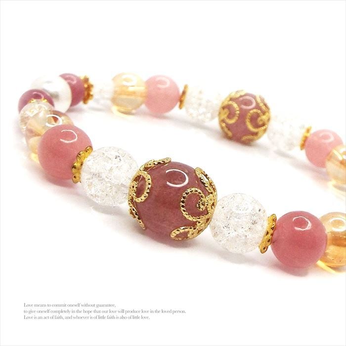 このブレスレットは、ストロベリークォーツとクラック水晶が絶妙に組み合わさっており、それぞれの石が持つ力が一つになって、心を開き、あなたの魅力を引き出すサポートをしてくれることでしょう。