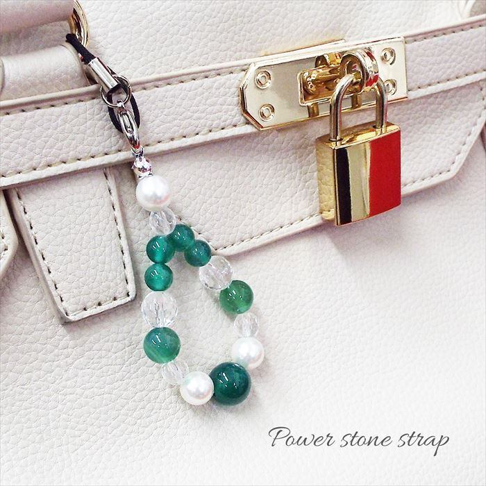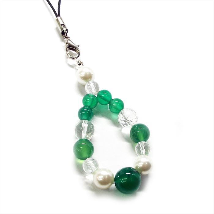 冷静と安定 天然石 ストラップ グリーンメノウ パール 水晶