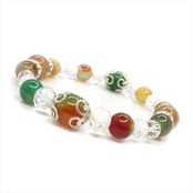 孔雀瑪瑙は独自の模様が美しく、持ち主に創造性と幸運をもたらす石です。その鮮やかな色合いは、心を晴れやかにし、ポジティブなエネルギーを注ぎます。アゲートは安定感を与え、心身のバランスを整える役割を果たします。さらに、水晶は浄化作用が強く、全てのエネルギーをクリアに保ちながら、持ち主の願いをサポートします。このブレスレットは、3つの天然石の力を組み合わせて、日常生活に必要なエネルギーを引き出すお手伝いをします。