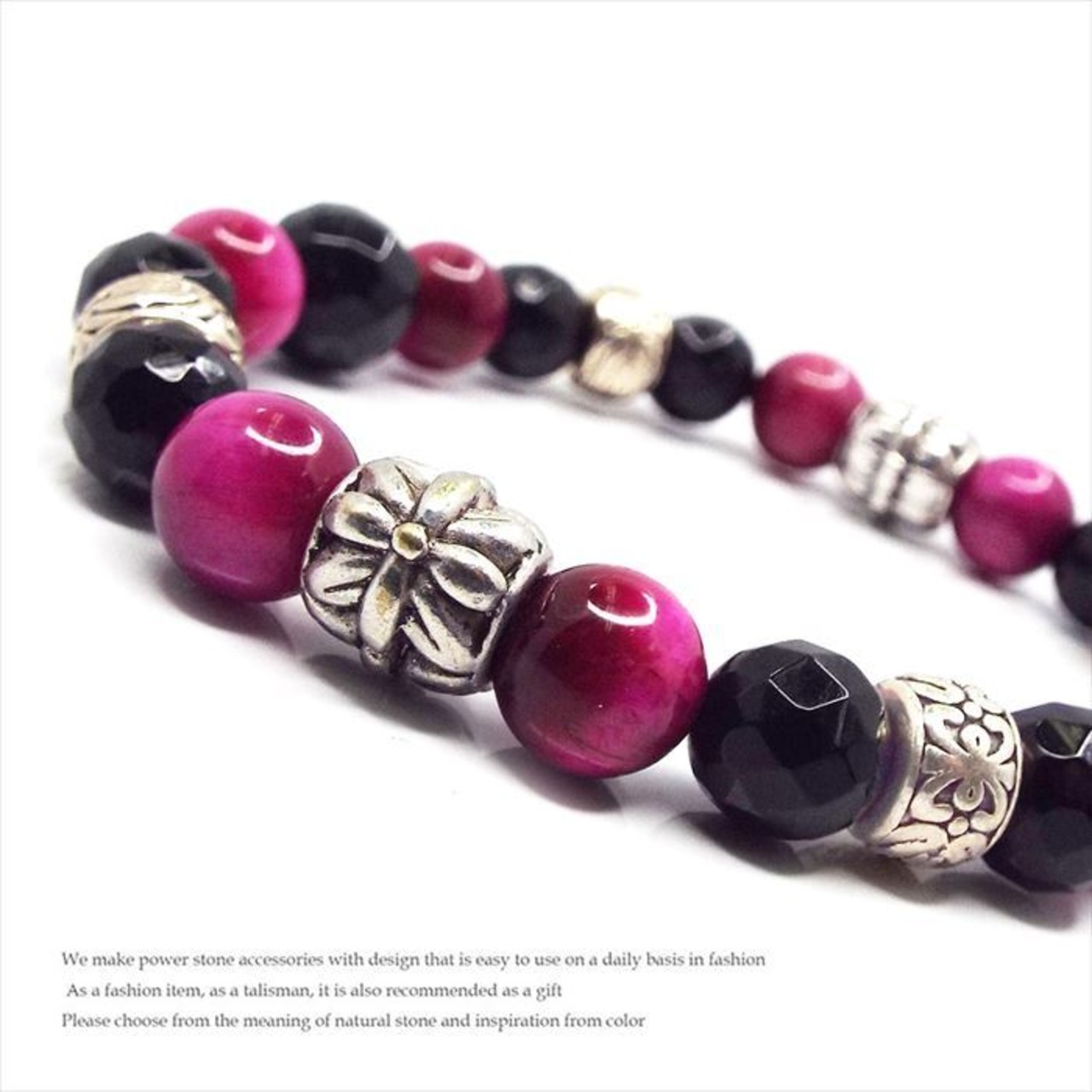 このブレスレットは、ピンクタイガーアイとオニキスが組み合わさることで、持ち主に魅力を与えつつ、心の安定を促す効果が期待されます。特に、人間関係を円滑にし、自信を持って行動するためのサポートをしてくれる素晴らしいアイテムです。