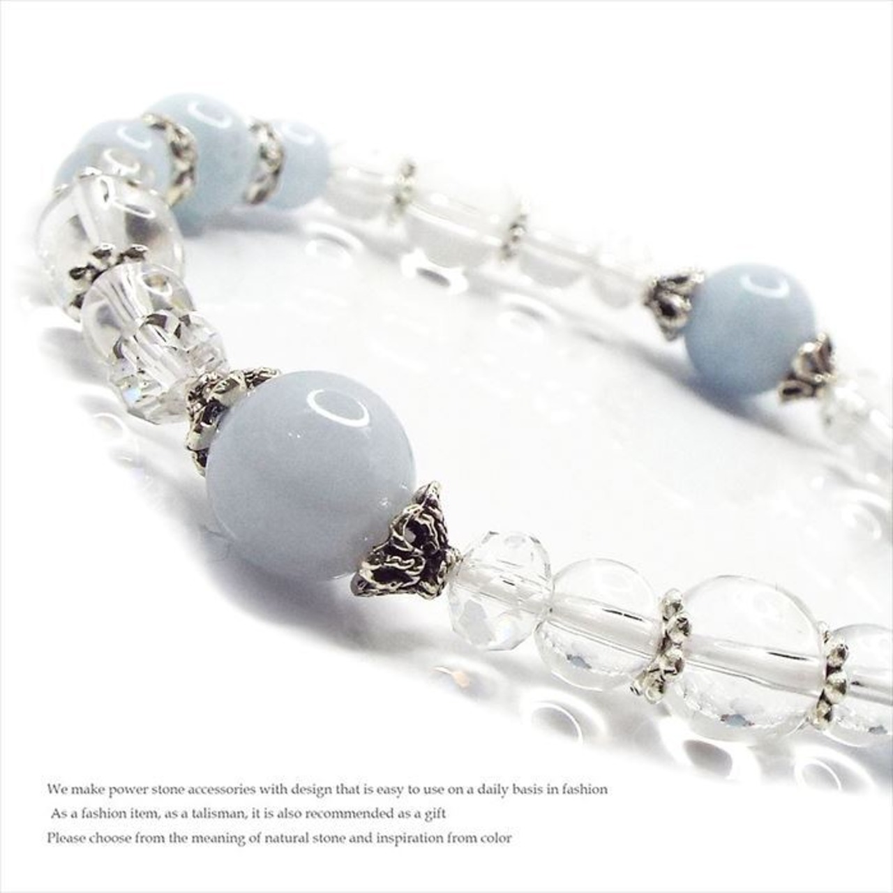 アクアマリンは持つことで感情を安定させ、不安やストレスを軽減する効果が期待されています。一方、水晶は持ち主のエネルギーを浄化し、ポジティブな思考をサポートします。このブレスレットを身につけることで、心の安定と日常のストレスからの解放を感じられるでしょう。