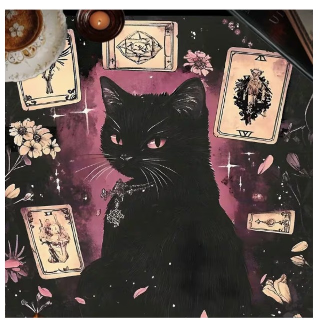 こちらの商品は2月下旬入荷後の発送になります。 現在は予約販売状態です。 タロットクロス(no.2) 三匹の黒猫 タロット占いをもっと楽しく、魅力的に演出するタロットクロス 黒猫の登場 シンプルでありながらも、黒猫のデザインが神秘的な雰囲気を醸し出します。 高品質なポリエステル素材を使用しているため、耐久性があり、使いやすさも抜群です。 タロットカードを美しく飾るためのアイテムとして、また占いの場を特別なものにするために最適です。 占いなどに興味がない方でも、 インテリアの飾り、敷物としてもおすすめです。 【商品詳細】 サイズ:約50cm × 約50cm 素材:ポリエステル100%(裏面は白無地) ■大切なご案内~必ずお読みください。 ・海外製品のため、サイズや形に多少のプリント印刷など個体差がございます。 ・掲載写真は実際のお品の色に近づけるよう心がけておりますが、パソコンやモニタによって若干異なることがございます。 ■発送・注文に関する情報や注意事項 ・ご購入後3日以内に発送いたします(土日含まず)。 ・クリックポストにて発送 発送は折りたたんで発送する為、多少の折りシワ等はございます。 (配送中の破損に関しては責任を負いかねますのでご了承ください)。 ■その他の情報や注意事項 ※ご注文後のキャンセル、返品、交換は一切出来かねます。 ※年末年始や大型連休、お盆時期は店舗休業となり発送に大幅な遅れが生じる場合があります。 その他、諸事情により発送が遅れる場合もメールにてご連絡致します。